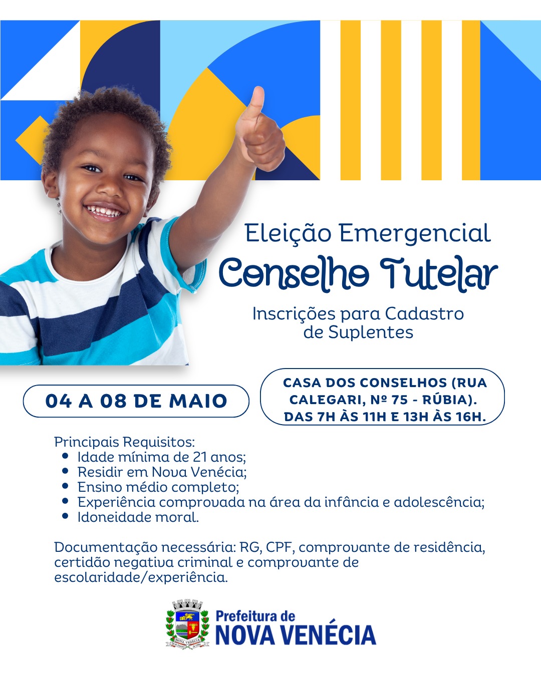 O Conselho Municipal dos Direitos da Criança e do Adolescente (CMDCA), anunciou para a próxima semana a abertura das inscrições para o Processo de Escolha Suplementar, em caráter emergencial, destinado à formação de cadastro de suplentes do Conselho Tutelar de Nova Venécia.
