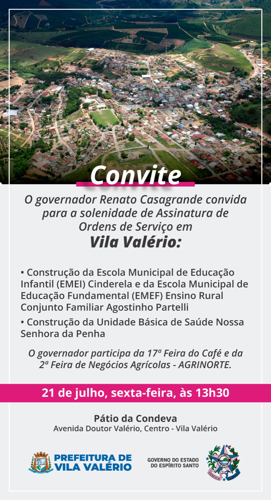 O Prefeito de Vila Valério, Davi Ramos, irá receber na próxima sexta-feira (21) o Governador do Estado do Espírito Santo, Renato Casagrande,  e juntamente com a Câmara Municipal de Vereadores do município vem a público convidar a todos para este grande evento.