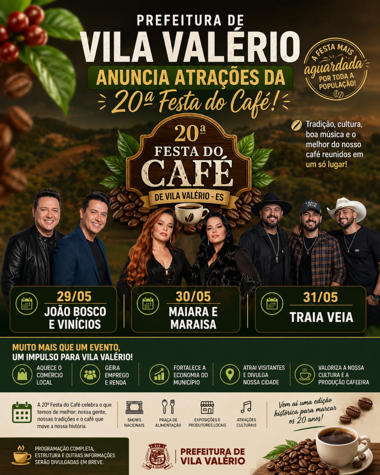 A edição deste ano da Festa do Café de Vila Valério chega à sua 20ª realização, consolidando-se como um dos principais eventos da região, reunindo cultura, música e valorização da economia local.